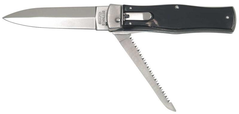 Automatikus kiugrós kés a Mikovtól. A pengéje rozsdamentes 420 acélból készült. A markolat bivaly agancsból készült és egy kis fűrészt is tartalmaz. Egy kézzel is könnyen nyitható. Bőr tokkal jár.