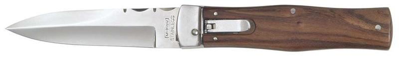 Automatikus kiugró Mikov kés. Pengéje RWL 34 acélból készült és törésálló. A markolat rózsafból készült. Egy kézzel is könnyen felnyitható. Bőrtokkal rendelkezik.